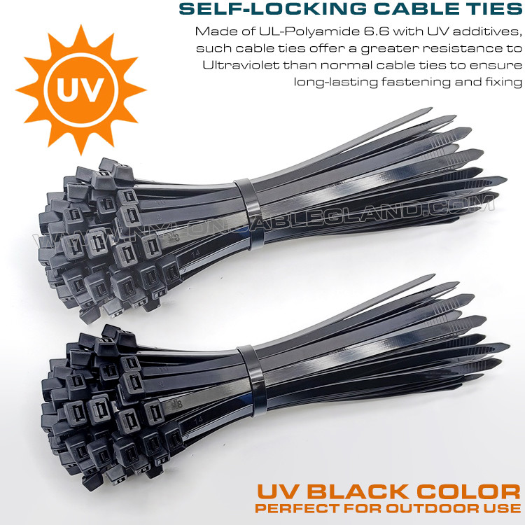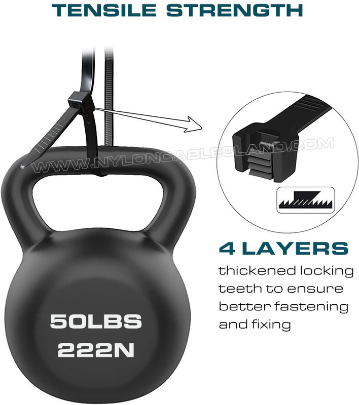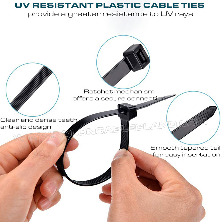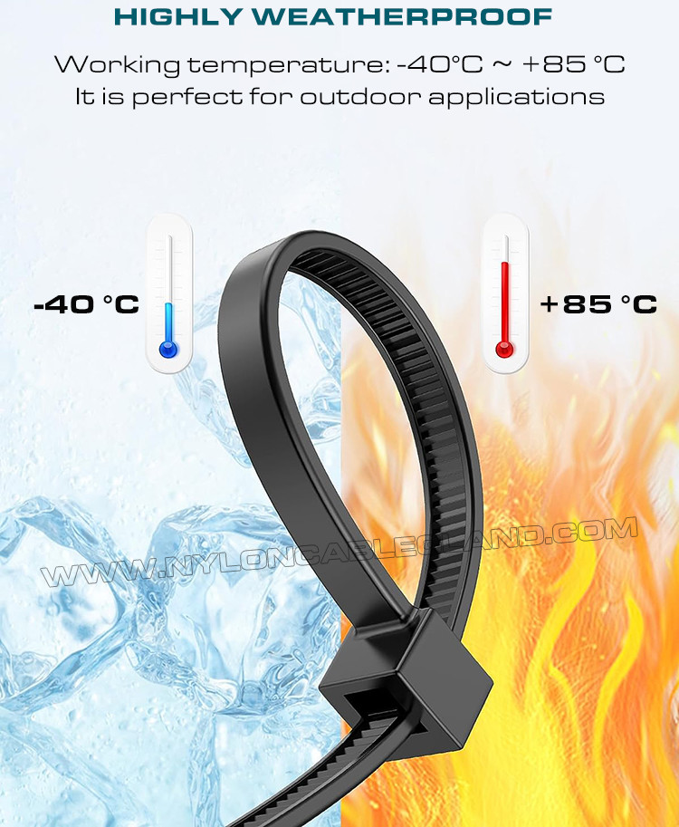 (২) উন্নত UV সুরক্ষা: UV সংযোজন সহ প্রিমিয়াম ব্ল্যাক পলিঅ্যামাইড 6.6 (UL 94V-2) দিয়ে তৈরি, এগুলি আবহাওয়া প্রতিরোধী, অন্তরক এবং বার্ধক্যের জন্য উপযুক্ত নয়, এবং -40℃ থেকে 85℃ (40°F - 185°F) পরিবেশে ব্যবহার করা যেতে পারে।