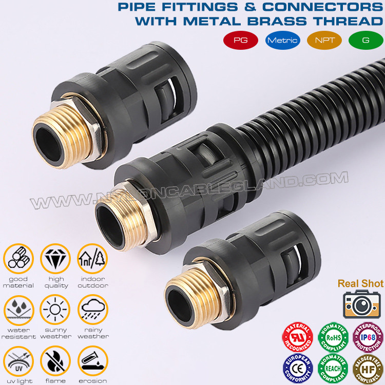 Waterproof Straight Connectors (Pipe Fittings) with Brass Male Thread PG7~PG48 for Plastic Corrugated Conduits AD7~AD108