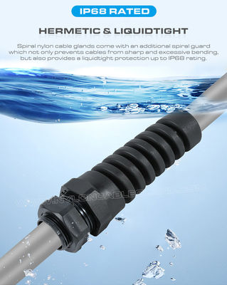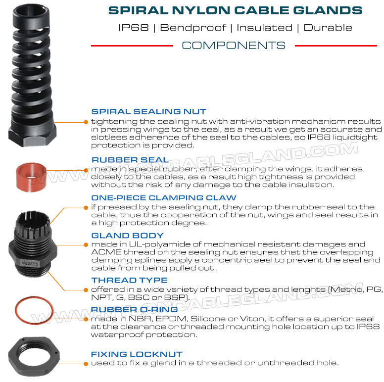 স্পাইরাল তারের গ্রন্থি (স্পাইরাল স্ট্রেন রিলিফ ক্যাবল গ্ল্যান্ড, স্ট্রেন রিলিফ নমনীয় কেবল গ্রন্থি সংযোগকারী) একটি অতিরিক্ত স্পাইরাল নমনীয় প্রটেক্টর দিয়ে ডিজাইন করা হয়েছে, এবং বাঁকানো স্থানে অতিরিক্ত বাঁকানোর বিরুদ্ধে সর্বোচ্চ কেবল সুরক্ষা প্রদান করে যাতে বৈদ্যুতিক লিকেজ এড়াতে বিরতির ঝুঁকি কমানো যায়। এটি UL-প্রত্যয়িত নাইলন 6 (পলিঅ্যামাইড 6) উপাদান দিয়ে তৈরি এবং ধূসর বা কালো রঙে পাওয়া যায় এবং PG7~PG21 থেকে আকারে পাওয়া যায়।